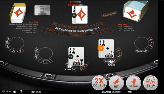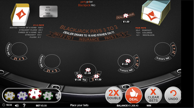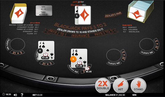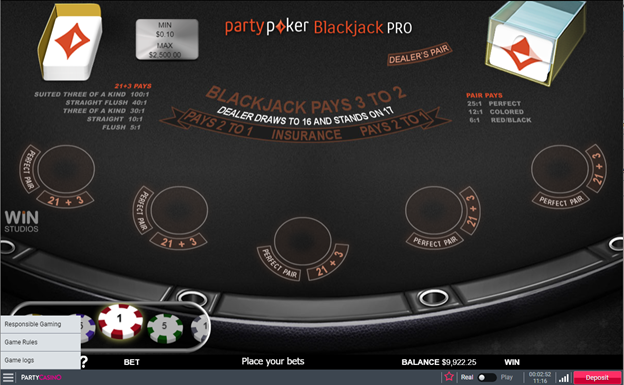 Partypoker Blackjack Pro is a variant of standard Blackjack that features the Perfect Pairs and 21+3 side games.