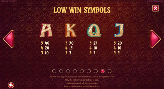 The Fortune Wins is a coin win game in Fortune Re-Spins and Free Spins with 5 levels. Each level has 5 steps with increasing win values. The player starts at the lowest step and moves up by collecting symbols on the reels. If the Key symbol lands on the reels, the Fortune Wins levels up. All wins from the Fortune Wins are increased, including the win from the achieved step.