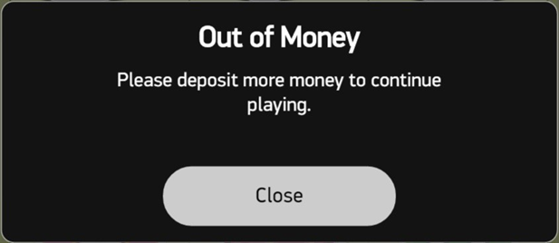 In case of an "out of money" event, an "out of money" message will be displayed to the player and the game will stay in an "unavailable" state until the player reloads the game.
